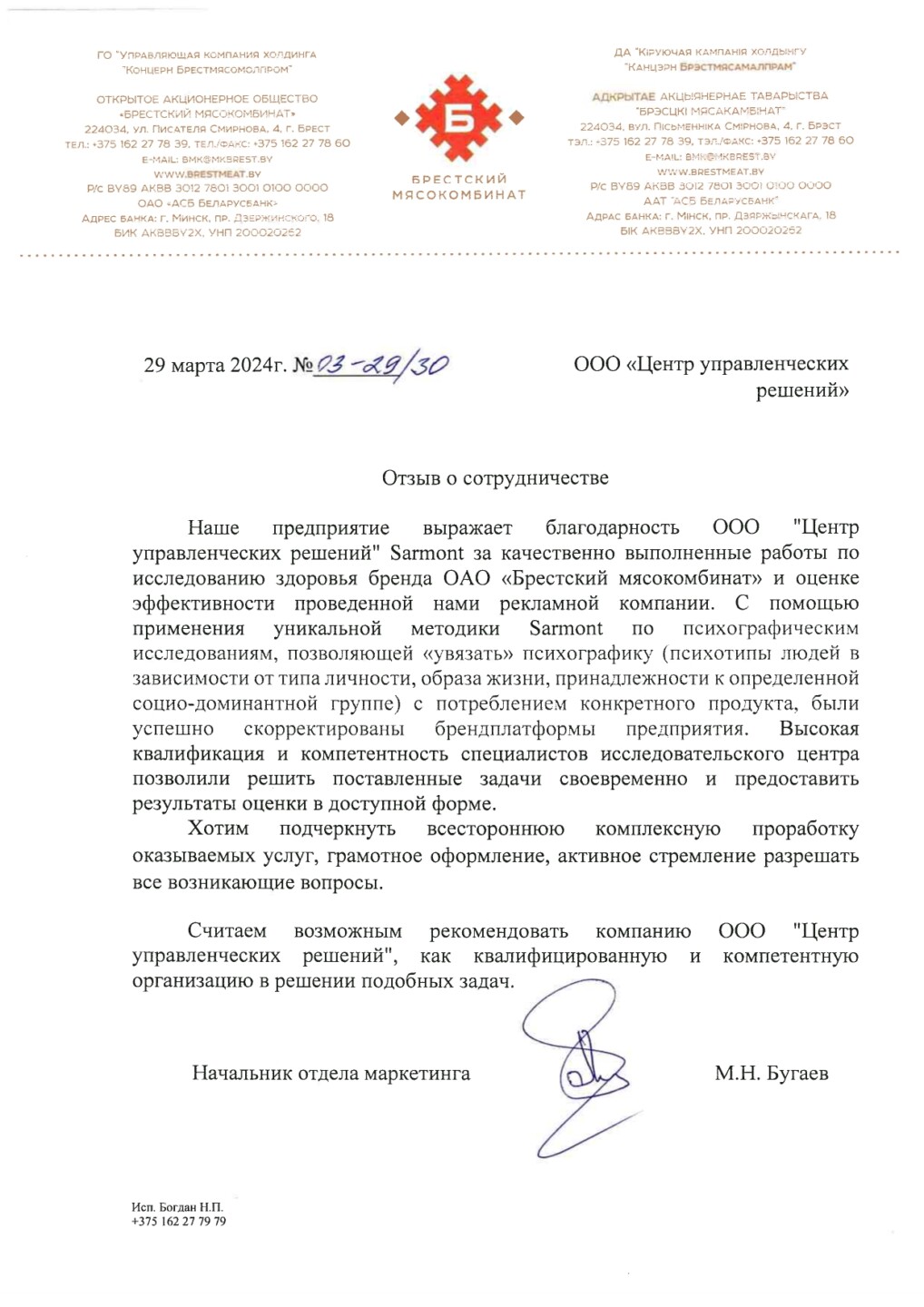 Наше предприятие выражает благодарность ООО «Центр управленческих решений» Sarmont за качественно выполненные работы по исследованию здоровья бренда ОАО «Брестский мясокомбинат» и оценке эффективности проведенной нами рекламной кампании. С помощью применения уникальной методики Sarmont по психографическим исследованиям, позволяющей «увязать» психографику (психотипы людей в зависимости от типа личности, образа жизни, принадлежности к определенной социо-доминантной группе) с потреблением конкретного продукта, были успешно скорректированы бренд-платформы предприятия. Высокая квалификация и компетентность специалистов исследовательского центра позволили решить поставленные задачи своевременно и предоставить результаты оценки в доступной форме.