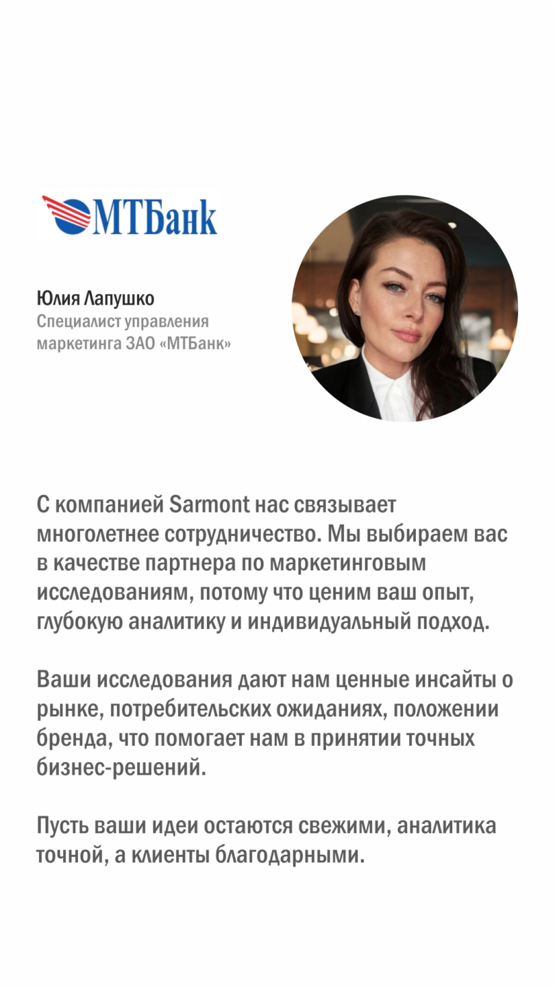 С компанией Sarmont нас связывает многолетнее сотрудничество. Мы выбираем вас в качестве партнера по маркетинговым исследованиям, потому что ценим ваш опыт, глубокую аналитику и индивидуальный подход. Ваши исследования дают нам ценные инсайты о рынке, потребительских ожиданиях, положении бренда, что помогает нам в принятии точных бизнес-решений.