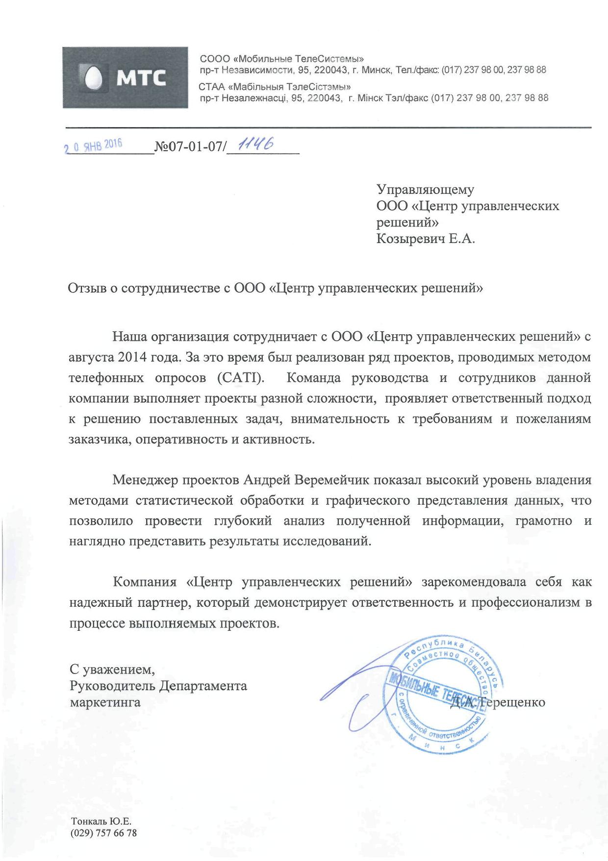 Наша организация сотрудничает с ООО «Центр управленческих решений» с августа 2014 года. За это время был реализован ряд проектов, проводимых методом телефонных опросов (CATI). Команда руководства и сотрудников данной компании выполняет проекты разной сложности, проявляет ответственный подход к решению поставленных задач, внимательность к требованиям и пожеланиям заказчика, оперативность и активность.