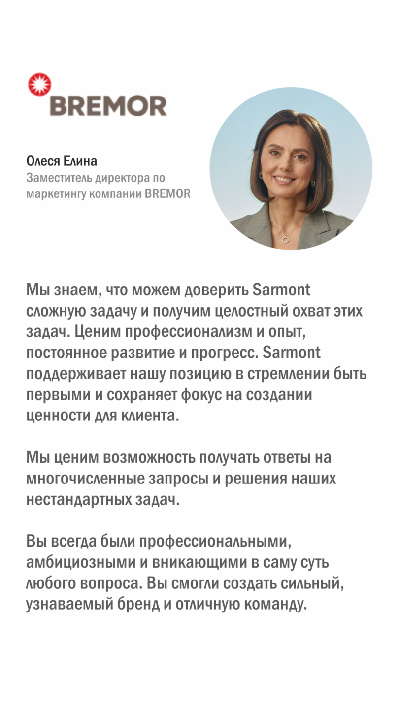 Почему мы выбираем Sarmont в качестве партнера по маркетинговым исследованиям? Мы знаем, что можем доверить Sarmont сложную задачу и получим целостный охват этих задач. Ценим профессионализм и опыт, постоянное развитие и прогресс. Sarmont поддерживает нашу позицию в стремлении быть первыми и сохраняет фокус на создании ценности для клиента.