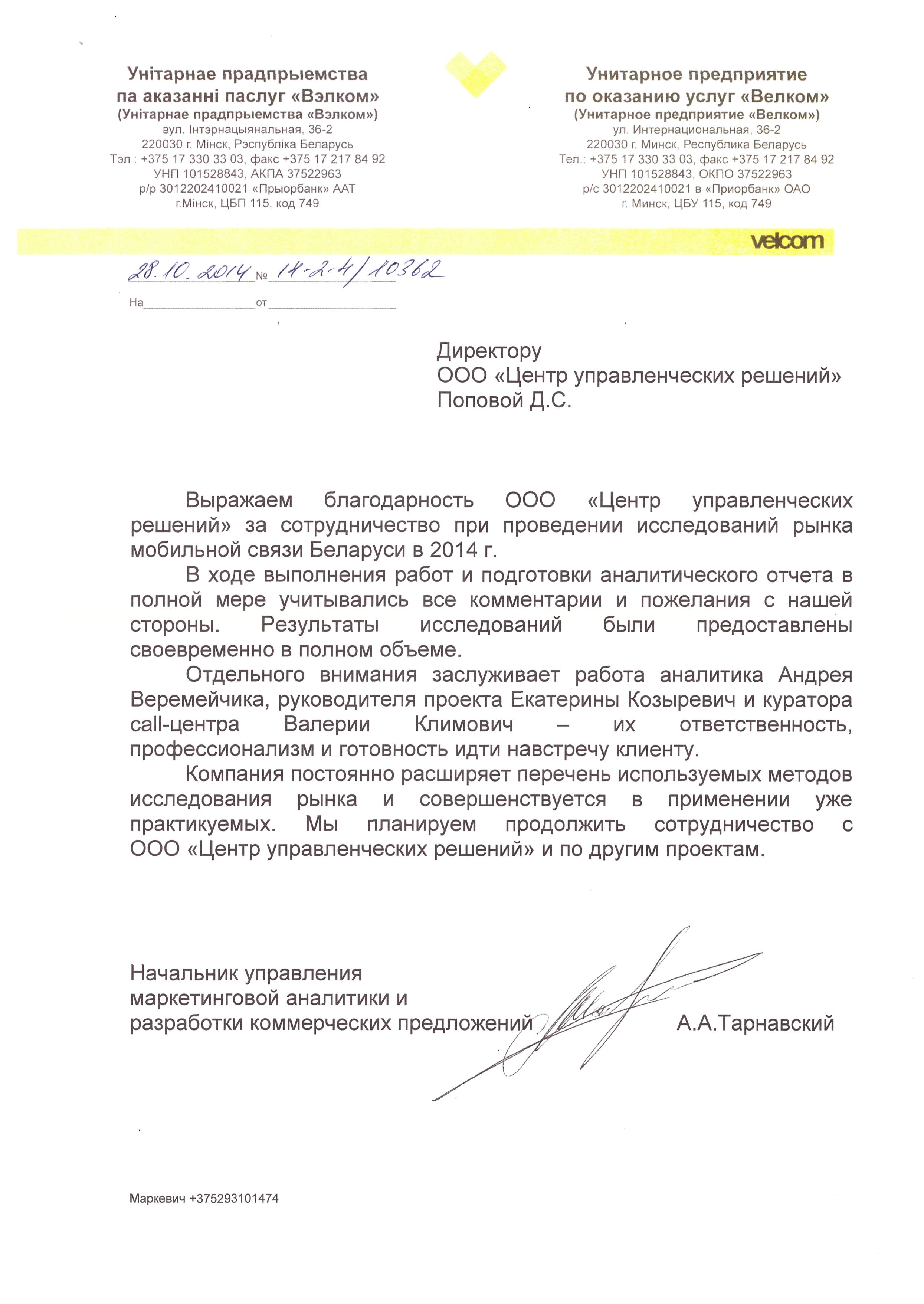 29.11.2017Выражаем благодарность ООО «Центр управленческих решений» за сотрудничество при проведении исследований рынка мобильной связи Беларуси в 2014 г.